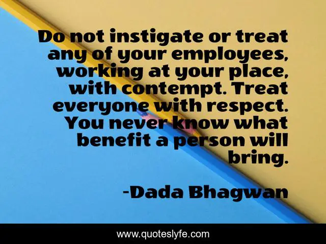 This page presents the quote "Do not instigate or treat any of your employees, working at your place, with contempt. Treat everyone with respect. You never know what benefit a person will bring.". Author of this quote is Dada Bhagwan. This quote is about person, employees, spiritual, respect,.
