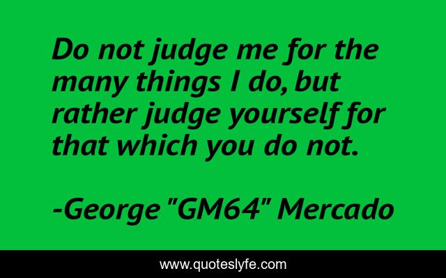 This page presents the quote "Do not judge me for the many things I do, but rather judge yourself for that which you do not.". Author of this quote is George "GM64" Mercado. This quote is about confidence, love, positive, positivity, motivational, spirituality, optimistic, inspirational, enthusiasm,.