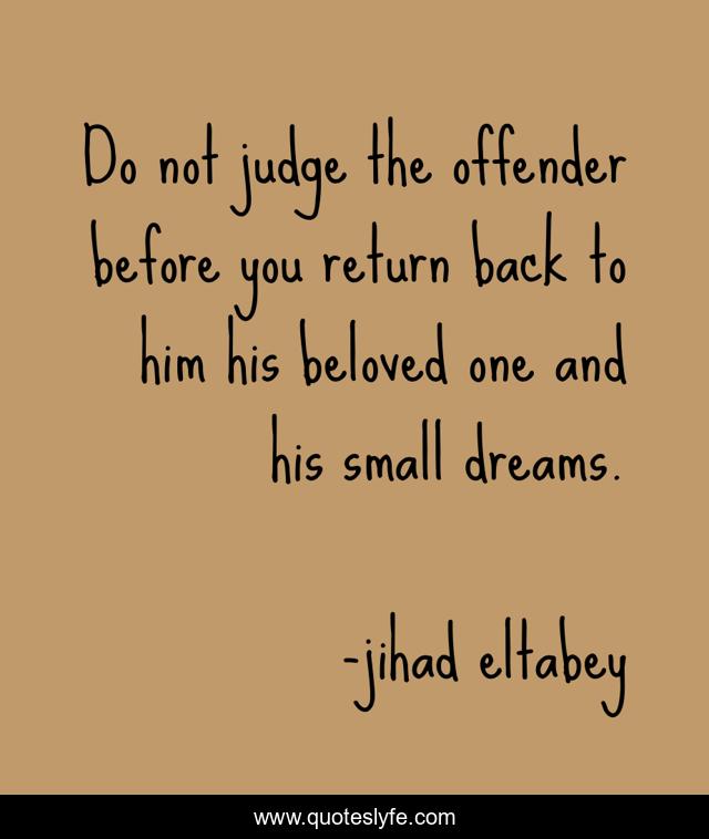 This page presents the quote "Do not judge the offender before you return back to him his beloved one and his small dreams.". Author of this quote is jihad eltabey. This quote is about judge, love, dreams, affection, crime,.