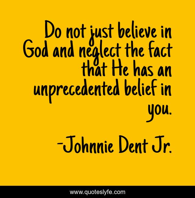 This page presents the quote "Do not just believe in God and neglect the fact that He has an unprecedented belief in you.". Author of this quote is Johnnie Dent Jr.. This quote is about confidence, self-confidence, motivation,.