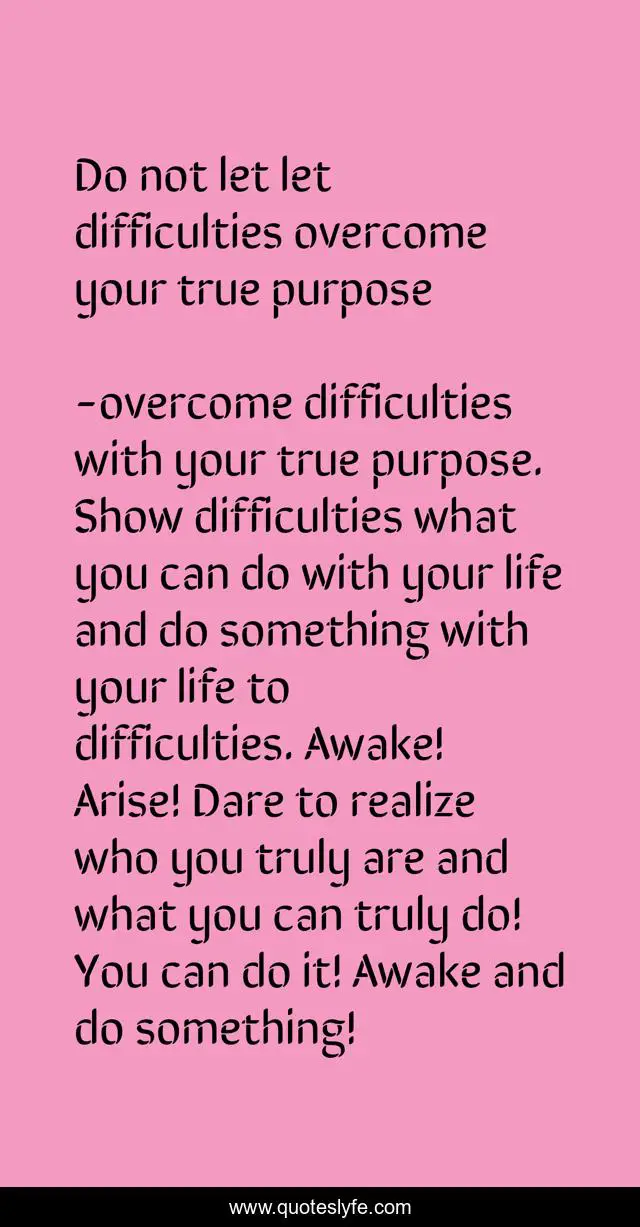 This page presents the quote "Do not let let difficulties overcome your true purpose". Author of this quote is overcome difficulties with your true purpose. Show difficulties what you can do with your life and do something with your life to difficulties. Awake! Arise! Dare to realize who you truly are and what you can truly do! You can do it! Awake and do something!. .