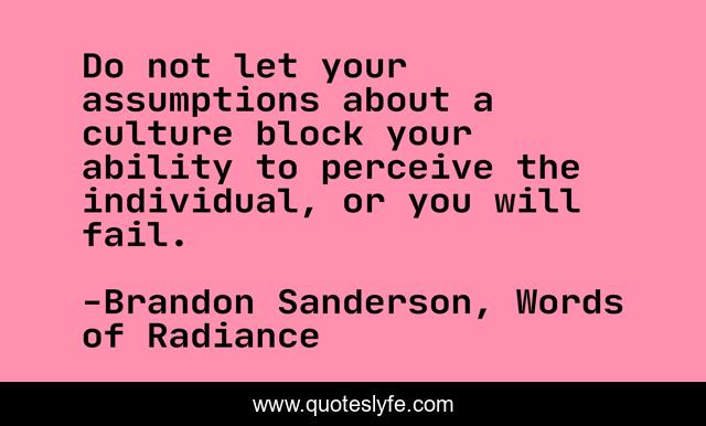 This page presents the quote "Do not let your assumptions about a culture block your ability to perceive the individual, or you will fail.". Author of this quote is Brandon Sanderson, Words of Radiance. This quote is about individuality, coexist, coexistence, prejudices, culture, prejudice, tolerance, descrimination,.