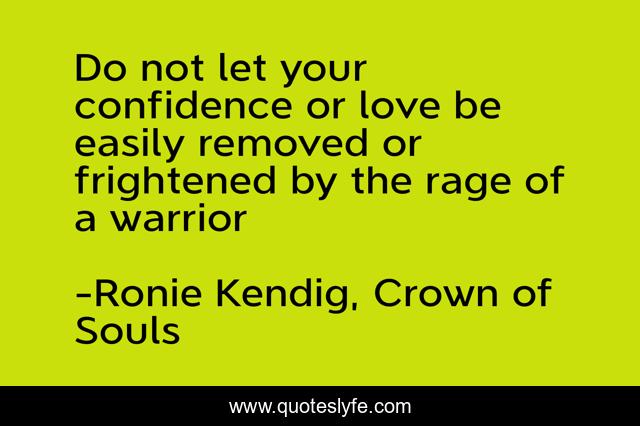 This page presents the quote "Do not let your confidence or love be easily removed or frightened by the rage of a warrior". Author of this quote is Ronie Kendig, Crown of Souls. This quote is about warrior, confidence, love, affection,.