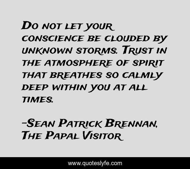 This page presents the quote "Do not let your conscience be clouded by unknown storms. Trust in the atmosphere of spirit that breathes so calmly deep within you at all times.". Author of this quote is Sean Patrick Brennan, The Papal Visitor. This quote is about conscience, spirit,.