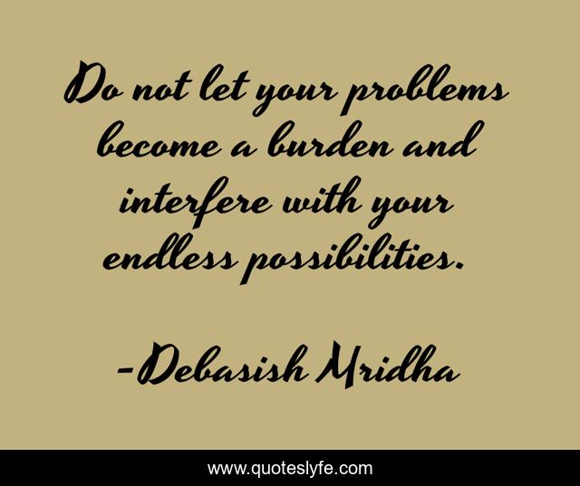This page presents the quote "Do not let your problems become a burden and interfere with your endless possibilities.". Author of this quote is Debasish Mridha. This quote is about do-not-let-your-problems, burdens, debasish-mridha, philosophy, problems, quotes, inspirational, enthusiasm, endless-possibilities,.