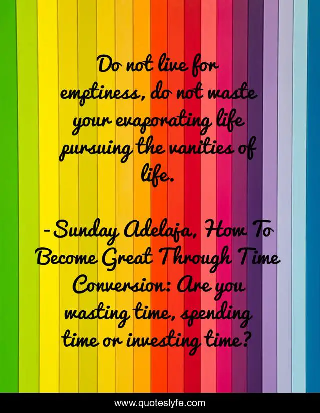 This page presents the quote "Do not live for emptiness, do not waste your evaporating life pursuing the vanities of life.". Author of this quote is Sunday Adelaja, How To Become Great Through Time Conversion: Are you wasting time, spending time or investing time?. This quote is about wasting-life, life, emptiness, conversion, productivity, wealth, greatness, waste, humanity,.