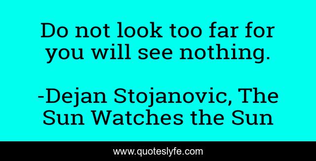 This page presents the quote "Do not look too far for you will see nothing.". Author of this quote is Dejan Stojanovic, The Sun Watches the Sun. This quote is about seeing, poets, literature, dejan-stojanovic, philosophy, poetry, wisdom, quotes, see,.