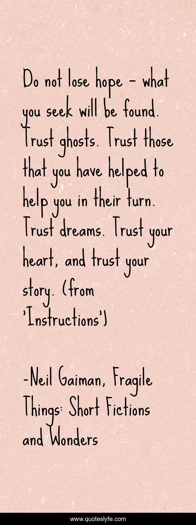 This page presents the quote "Do not lose hope — what you seek will be found. Trust ghosts. Trust those that you have helped to help you in their turn. Trust dreams. Trust your heart, and trust your story. (from 'Instructions')". Author of this quote is Neil Gaiman, Fragile Things: Short Fictions and Wonders. This quote is about life, trust, story, hope,.