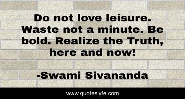This page presents the quote "Do not love leisure. Waste not a minute. Be bold. Realize the Truth, here and now!". Author of this quote is Swami Sivananda. This quote is about love, bold, affection, realize,.