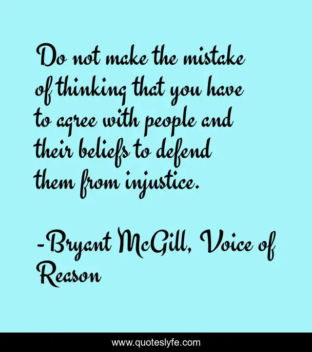 This page presents the quote "Do not make the mistake of thinking that you have to agree with people and their beliefs to defend them from injustice.". Author of this quote is Bryant McGill, Voice of Reason. This quote is about justice, freedom, guards, guarding, free-speech, protection, injustice, beliefs,.