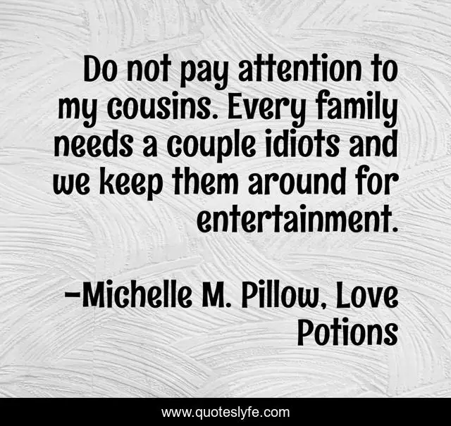 This page presents the quote "Do not pay attention to my cousins. Every family needs a couple idiots and we keep them around for entertainment.". Author of this quote is Michelle M. Pillow, Love Potions. This quote is about warlock, humor, power, witchcraft, macgregor, spell, love-potions, walk-of-shame, scottish,.