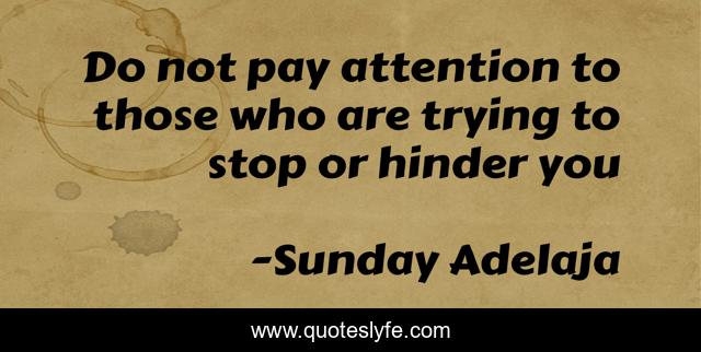 This page presents the quote "Do not pay attention to those who are trying to stop or hinder you". Author of this quote is Sunday Adelaja. This quote is about faith, calling, focus, purpose, hindrance,.