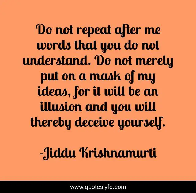 This page presents the quote "Do not repeat after me words that you do not understand. Do not merely put on a mask of my ideas, for it will be an illusion and you will thereby deceive yourself.". Author of this quote is Jiddu Krishnamurti. This quote is about autonomy, imitation, knowledge,.