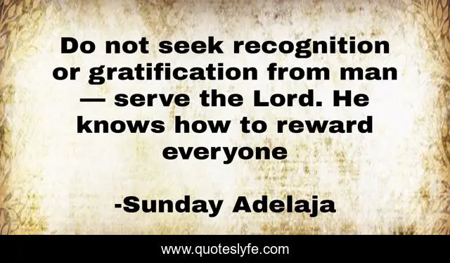 This page presents the quote "Do not seek recognition or gratification from man — serve the Lord. He knows how to reward everyone". Author of this quote is Sunday Adelaja. This quote is about service, calling, gratification, lord, reward, recognition,.