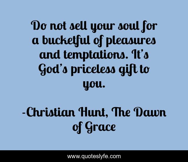 This page presents the quote "Do not sell your soul for a bucketful of pleasures and temptations. It’s God’s priceless gift to you.". Author of this quote is Christian Hunt, The Dawn of Grace. This quote is about false-salvation, gifts-of-the-spirit, christian, temptation, divine-love, christain-life, soul, christianity, gifts-from-heaven,.