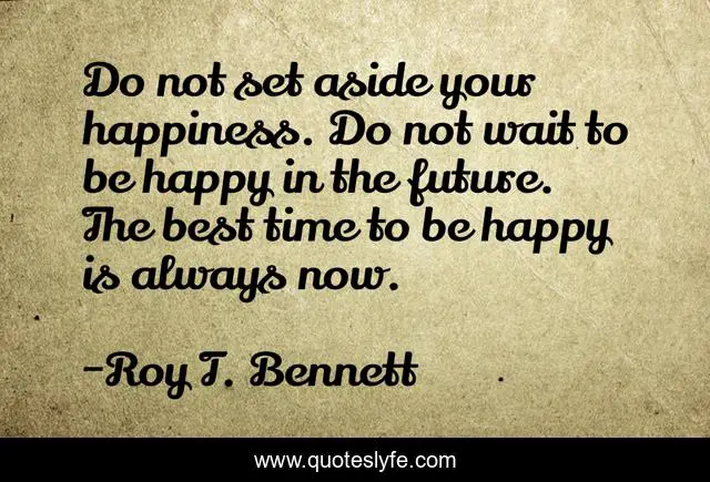 This page presents the quote "Do not set aside your happiness. Do not wait to be happy in the future. The best time to be happy is always now.". Author of this quote is Roy T. Bennett. This quote is about living, inspiring, inspire, inspiration, positive, living-now, life, confidence, optimism,.