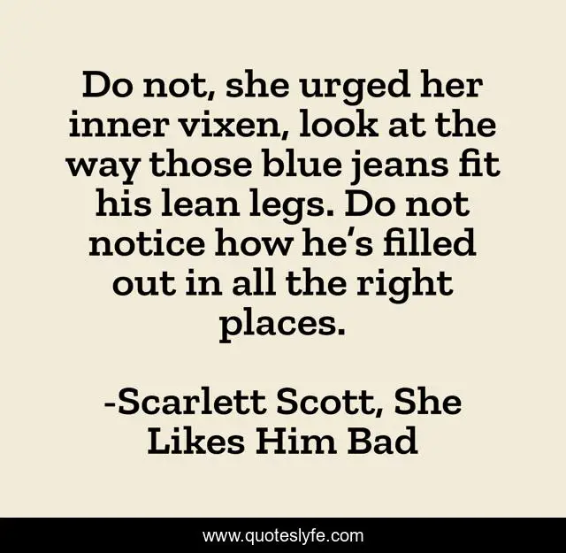 This page presents the quote "Do not, she urged her inner vixen, look at the way those blue jeans fit his lean legs. Do not notice how he’s filled out in all the right places.". Author of this quote is Scarlett Scott, She Likes Him Bad. This quote is about erotica-romance, contemporary-romance,.