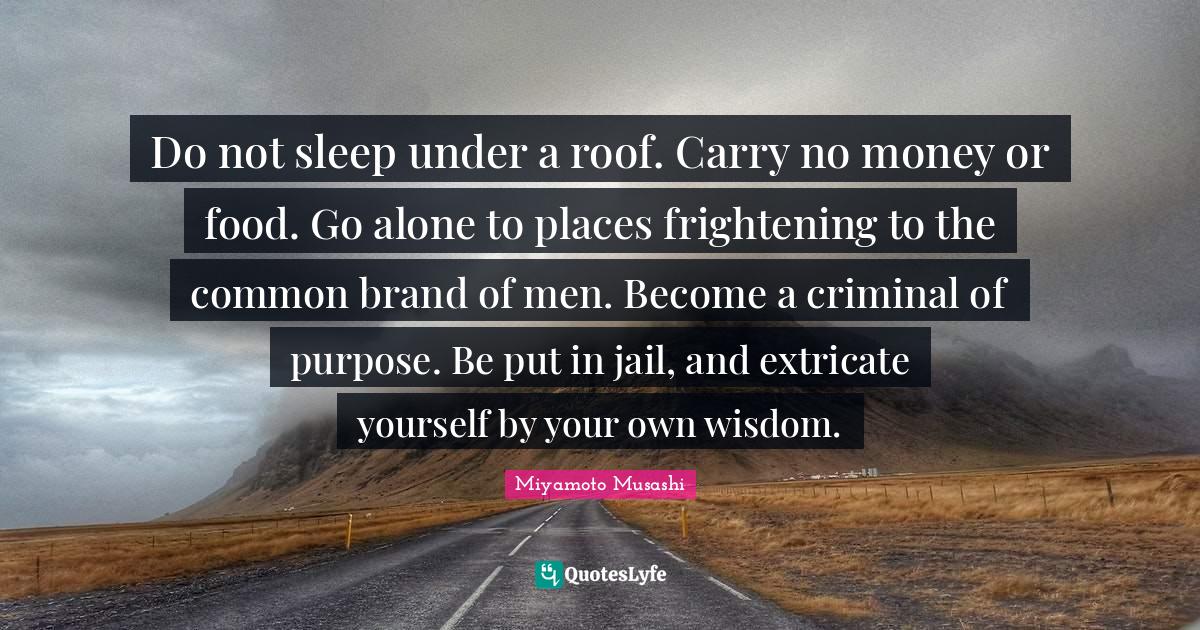 This page presents the quote "Do not sleep under a roof. Carry no money or food. Go alone to places frightening to the common brand of men. Become a criminal of purpose. Be put in jail, and extricate yourself by your own wisdom.". Author of this quote is Miyamoto Musashi. This quote is about frightening, sleep, men, food, roof, no money, common, purpose, wisdom,.