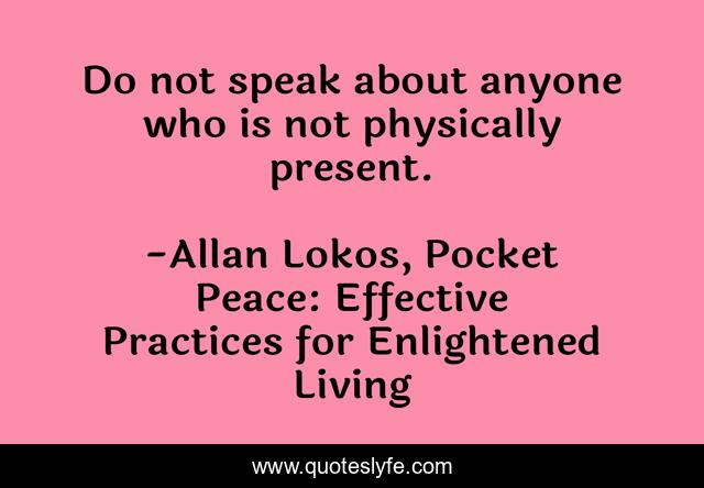 This page presents the quote "Do not speak about anyone who is not physically present.". Author of this quote is Allan Lokos, Pocket Peace: Effective Practices for Enlightened Living. This quote is about enthusiasm, meditation, inspiration, inspirational, mindfulness,.