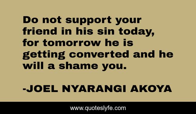 This page presents the quote "Do not support your friend in his sin today, for tomorrow he is getting converted and he will a shame you.". Author of this quote is JOEL NYARANGI AKOYA. .