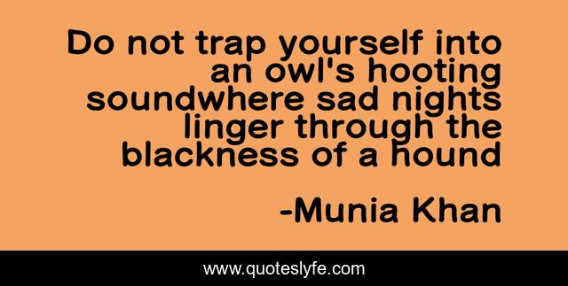 This page presents the quote "Do not trap yourself into an owl's hooting soundwhere sad nights linger through the blackness of a hound". Author of this quote is Munia Khan. This quote is about sound, hooting, hound, darkness, linger, poem, sad, owls, sadness,.