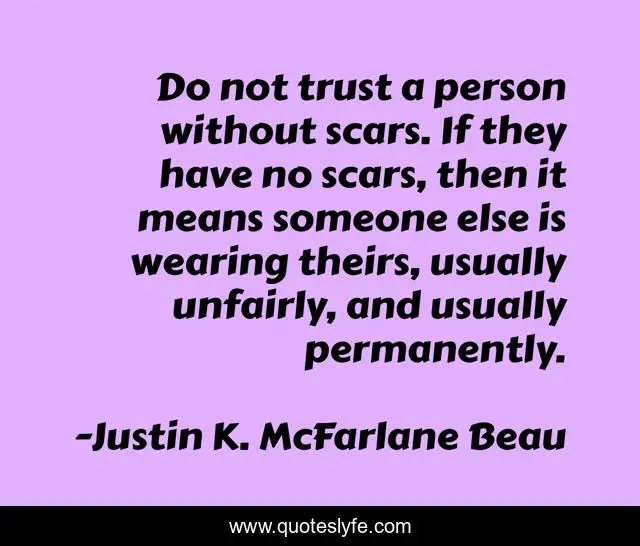 This page presents the quote "Do not trust a person without scars. If they have no scars, then it means someone else is wearing theirs, usually unfairly, and usually permanently.". Author of this quote is Justin K. McFarlane Beau. This quote is about trust, pain, scars,.