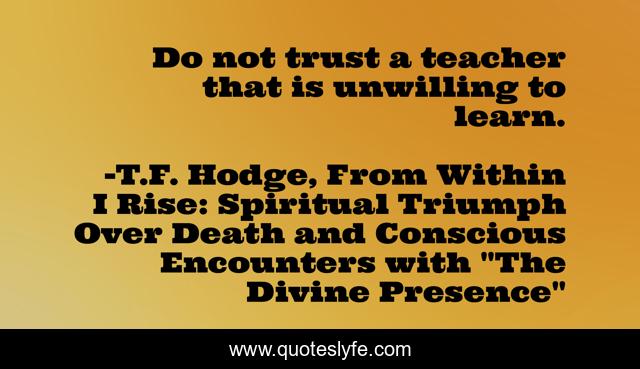 This page presents the quote "Do not trust a teacher that is unwilling to learn.". Author of this quote is T.F. Hodge, From Within I Rise: Spiritual Triumph Over Death and Conscious Encounters with "The Divine Presence". This quote is about trustworthiness, trustworthy, pupil, student, learn, trust, teacher,.