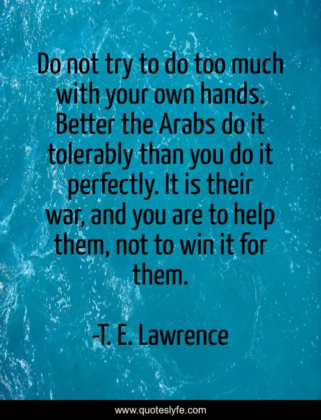 This page presents the quote "Do not try to do too much with your own hands. Better the Arabs do it tolerably than you do it perfectly. It is their war, and you are to help them, not to win it for them.". Author of this quote is T. E. Lawrence. This quote is about win, help, hands,.