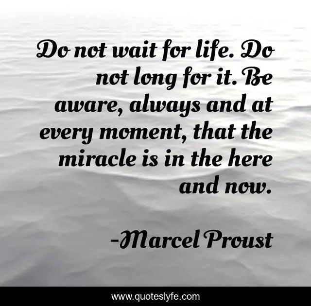 This page presents the quote "Do not wait for life. Do not long for it. Be aware, always and at every moment, that the miracle is in the here and now.". Author of this quote is Marcel Proust. This quote is about enthusiasm, inspirational,.