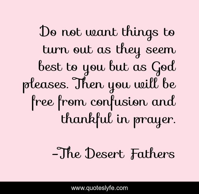 This page presents the quote "Do not want things to turn out as they seem best to you but as God pleases. Then you will be free from confusion and thankful in prayer.". Author of this quote is The Desert Fathers. .