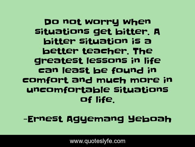 This page presents the quote "Do not worry when situations get bitter. A bitter situation is a better teacher. The greatest lessons in life can least be found in comfort and much more in uncomfortable situations of life.". Author of this quote is Ernest Agyemang Yeboah. This quote is about comfort-zone, daring-greatly, confidence, comfort, daring, lesson-for-life, positive, motivational, bitterness,.
