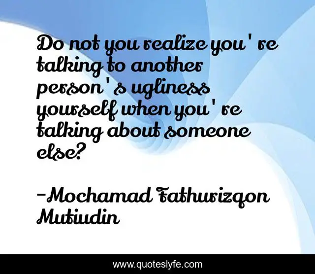 This page presents the quote "Do not you realize you're talking to another person's ugliness yourself when you're talking about someone else?". Author of this quote is Mochamad Fathurizqon Mutiudin. This quote is about life, live,.