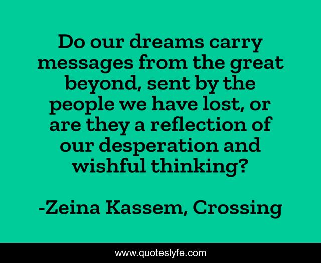 This page presents the quote "Do our dreams carry messages from the great beyond, sent by the people we have lost, or are they a reflection of our desperation and wishful thinking?". Author of this quote is Zeina Kassem, Crossing. This quote is about arab, life, death, pain, middle-eastern, missing, lebanon, missing-someone, grief,.