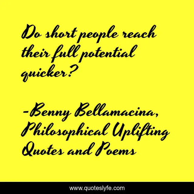 This page presents the quote "Do short people reach their full potential quicker?". Author of this quote is Benny Bellamacina, Philosophical Uplifting Quotes and Poems. This quote is about life, humor, philosophy, wisdom, quotes, comedy,.