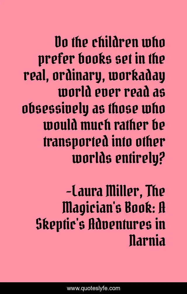 This page presents the quote "Do the children who prefer books set in the real, ordinary, workaday world ever read as obsessively as those who would much rather be transported into other worlds entirely?". Author of this quote is Laura Miller, The Magician's Book: A Skeptic's Adventures in Narnia. This quote is about escapism, reality, fantasy, books, reading, children,.