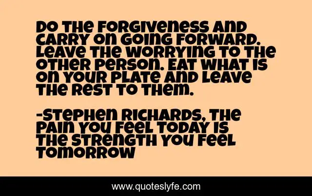 This page presents the quote "Do the forgiveness and carry on going forward. Leave the worrying to the other person. Eat what is on your plate and leave the rest to them.". Author of this quote is Stephen Richards, The Pain You Feel Today Is The Strength You Feel Tomorrow. This quote is about empowering, confidence, moving-on-and-letting-go, healing-the-past, motivational, forgive, stephen-richards-author, stephen-richards, suffering,.