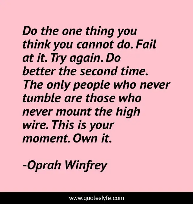 This page presents the quote "Do the one thing you think you cannot do. Fail at it. Try again. Do better the second time. The only people who never tumble are those who never mount the high wire. This is your moment. Own it.". Author of this quote is Oprah Winfrey. This quote is about confidence, people, positive, motivational, moment, optimistic,.