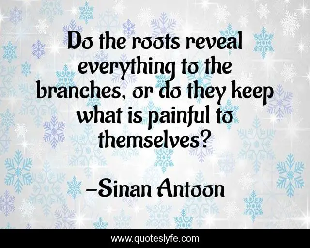 This page presents the quote "Do the roots reveal everything to the branches, or do they keep what is painful to themselves?". Author of this quote is Sinan Antoon. This quote is about branches, pain, roots, trees,.