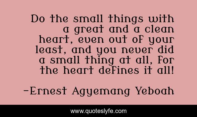 This page presents the quote "Do the small things with a great and a clean heart, even out of your least, and you never did a small thing at all, for the heart defines it all!". Author of this quote is Ernest Agyemang Yeboah. This quote is about faith, life, giving, little-things-that-glorifies-god, christian-living, clean-heart,.
