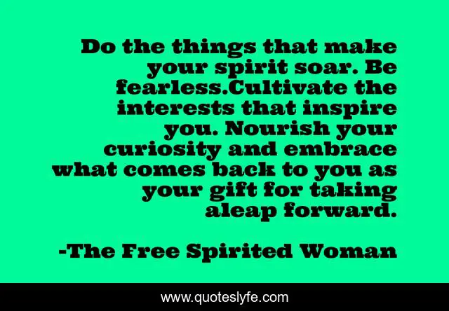 This page presents the quote "Do the things that make your spirit soar. Be fearless.Cultivate the interests that inspire you. Nourish your curiosity and embrace what comes back to you as your gift for taking aleap forward.". Author of this quote is The Free Spirited Woman. This quote is about fearless, the-free-spirited-woman, inspire, curiosity,.