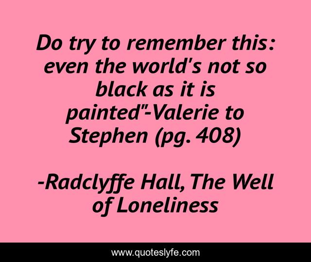 This page presents the quote "Do try to remember this: even the world's not so black as it is painted"-Valerie to Stephen (pg. 408)". Author of this quote is Radclyffe Hall, The Well of Loneliness. This quote is about world, hope, optimism,.