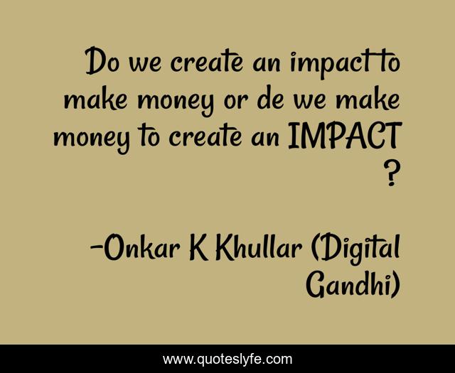 This page presents the quote "Do we create an impact to make money or de we make money to create an IMPACT ?". Author of this quote is Onkar K Khullar (Digital Gandhi). This quote is about heart, spiritual, art, inspire, freedom, god, ocial-entrepreneur, self-help, soul,.