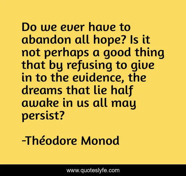 This page presents the quote "Do we ever have to abandon all hope? Is it not perhaps a good thing that by refusing to give in to the evidence, the dreams that lie half awake in us all may persist?". Author of this quote is Théodore Monod. This quote is about dreams, hope,.