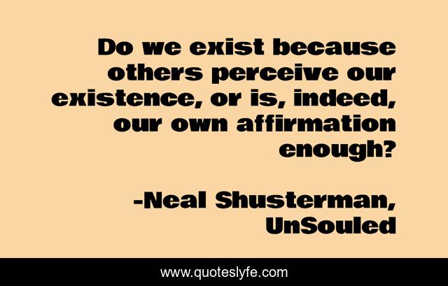 This page presents the quote "Do we exist because others perceive our existence, or is, indeed, our own affirmation enough?". Author of this quote is Neal Shusterman, UnSouled. This quote is about young-adult, science-fiction, unsouled,.