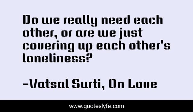 This page presents the quote "Do we really need each other, or are we just covering up each other's loneliness?". Author of this quote is Vatsal Surti, On Love. This quote is about loneliness, love, affection,.