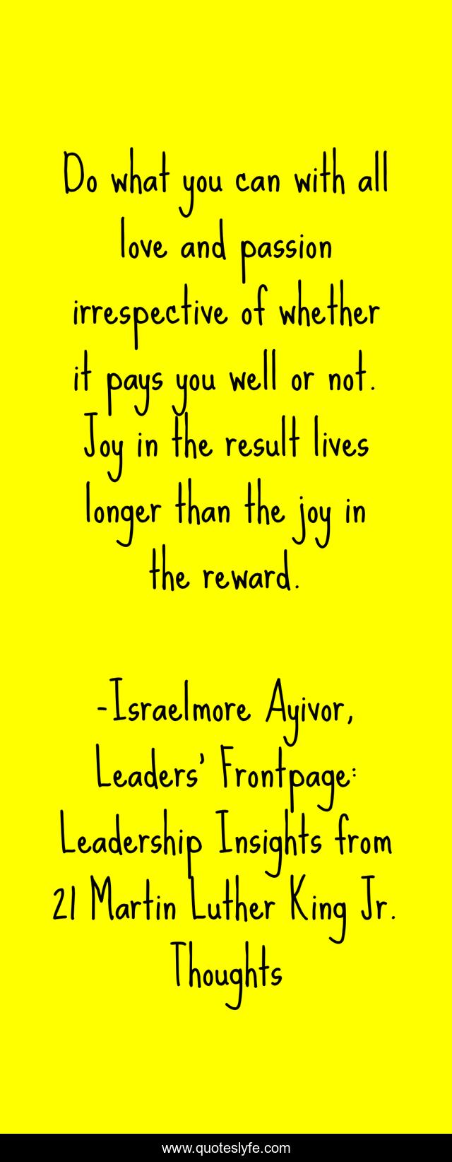 This page presents the quote "Do what you can with all love and passion irrespective of whether it pays you well or not. Joy in the result lives longer than the joy in the reward.". Author of this quote is Israelmore Ayivor, Leaders' Frontpage: Leadership Insights from 21 Martin Luther King Jr. Thoughts. This quote is about happy, food-for-thought, martin-luther, money, leaders, martin-luther-king-jr, personal-branding, wealth, martin-luther-king,.