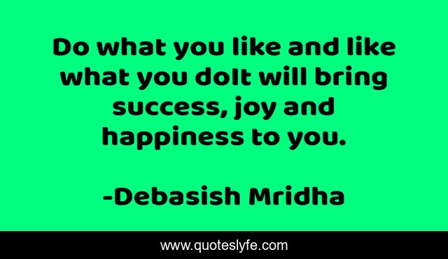 This page presents the quote "Do what you like and like what you doIt will bring success, joy and happiness to you.". Author of this quote is Debasish Mridha. This quote is about life, love, knowledge, success, inspirational, joy, philosophy, wisdom, affection,.