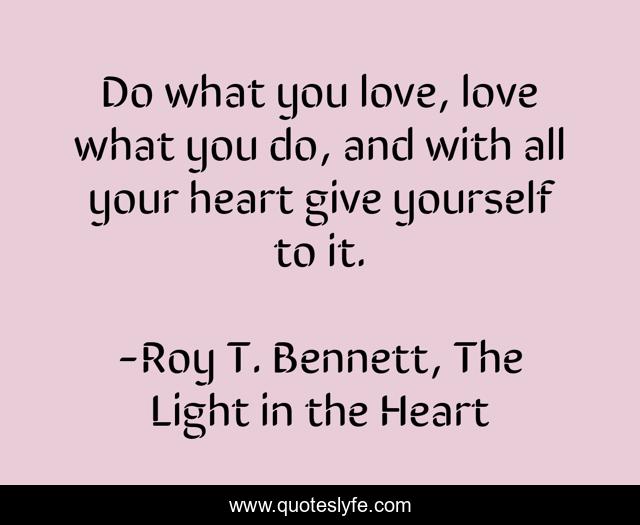 This page presents the quote "Do what you love, love what you do, and with all your heart give yourself to it.". Author of this quote is Roy T. Bennett, The Light in the Heart. This quote is about heart, motivation, love, inspire, optimistic, inspirational-life, life-and-living, living, inspiring,.
