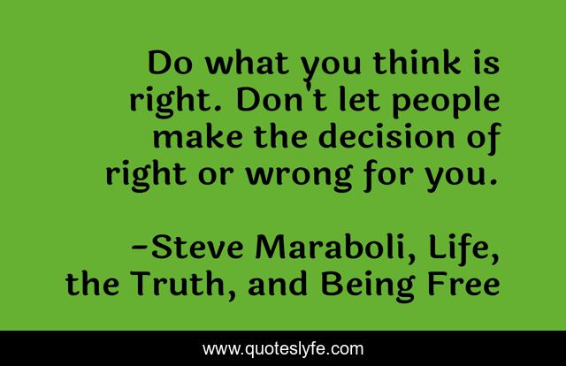 This page presents the quote "Do what you think is right. Don't let people make the decision of right or wrong for you.". Author of this quote is Steve Maraboli, Life, the Truth, and Being Free. This quote is about confidence, right, conviction, positive, motivational, choice, wrong, self-empowerment, optimistic,.