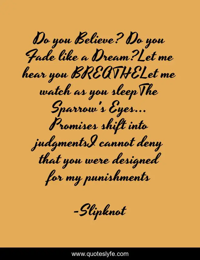 This page presents the quote "Do you Believe? Do you Fade like a Dream?Let me hear you BREATHELet me watch as you sleepThe Sparrow's Eyes... Promises shift into judgmentsI cannot deny that you were designed for my punishments". Author of this quote is Slipknot. This quote is about judgement, slipknot, sleep,.